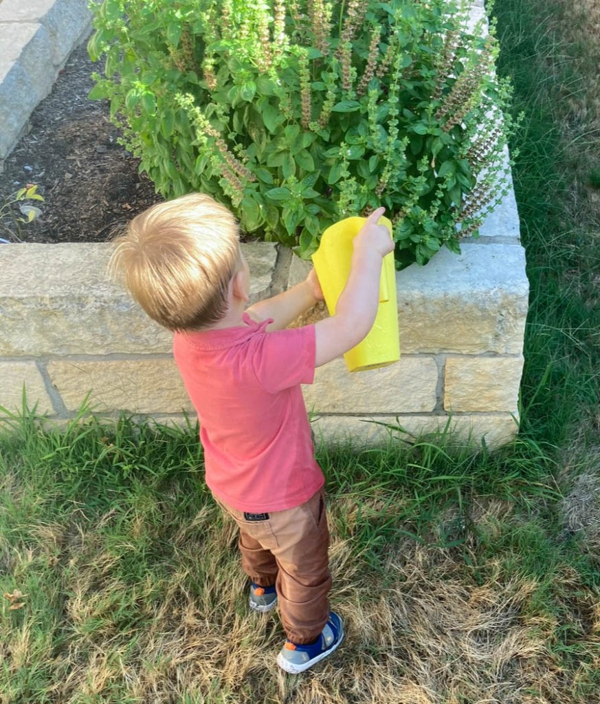 This year, our little gardener helped plant strawberries, basil (pictured below!), and a variety of herbs and vegetables. He loves using his little watering can to care for them.